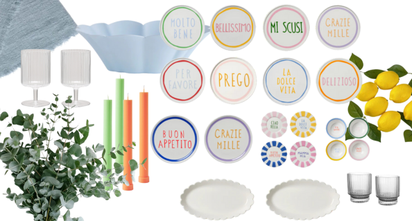 The fresh, crisp white tablecloth provides the perfect backdrop, allowing the bold, colourful plates to shine. The result is a tablescape that effortlessly combines vibrant colours, eclectic patterns, and a touch of elegance — creating a lively, European-inspired scene that sets the perfect tone for a relaxed yet stylish gathering.
